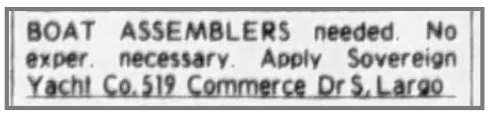 clipping_15927135 ← Previous Next → Newspaper Classified ad recruiting assemblers in the early days of Sovereign Yacht Co., Inc.