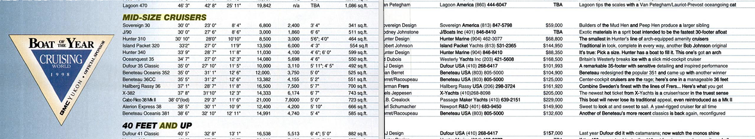In October of 1997, the yet-to-be produced Sovereign 30′ was included in Cruising World‘s “1998 New-Boat Showcase”. A distinction that, no doubt was given in exchange for the three full-page insertions of the same ad which were placed in the August, September and October 1997 issues of that publication.