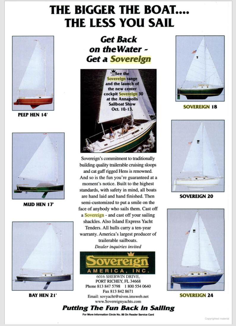 The most notable development of the Sovereign America era was the Sovereign 30′. The ad displayed above announces that the launch was planned to take place at the Annapolis Sailboat Show, later that year.