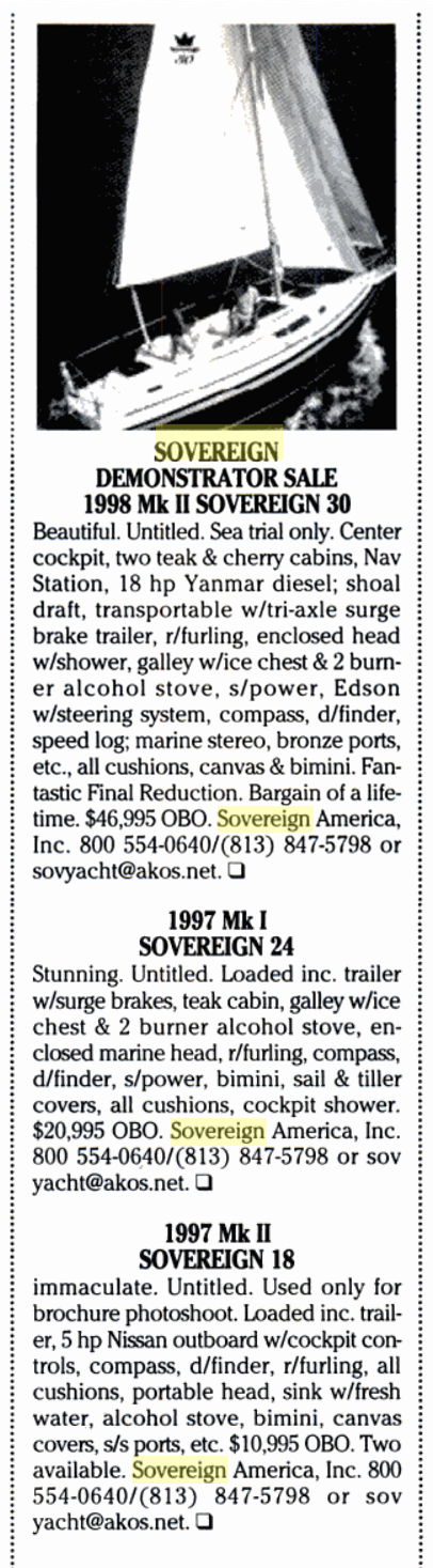 Screen Shot 2017-12-14 at 10.17.13 PM ← Previous Next → Classified ads for Sovereign liquidation, including the lone Sovereign 30′, Cruising World – January 1998
